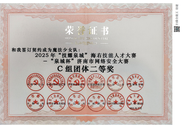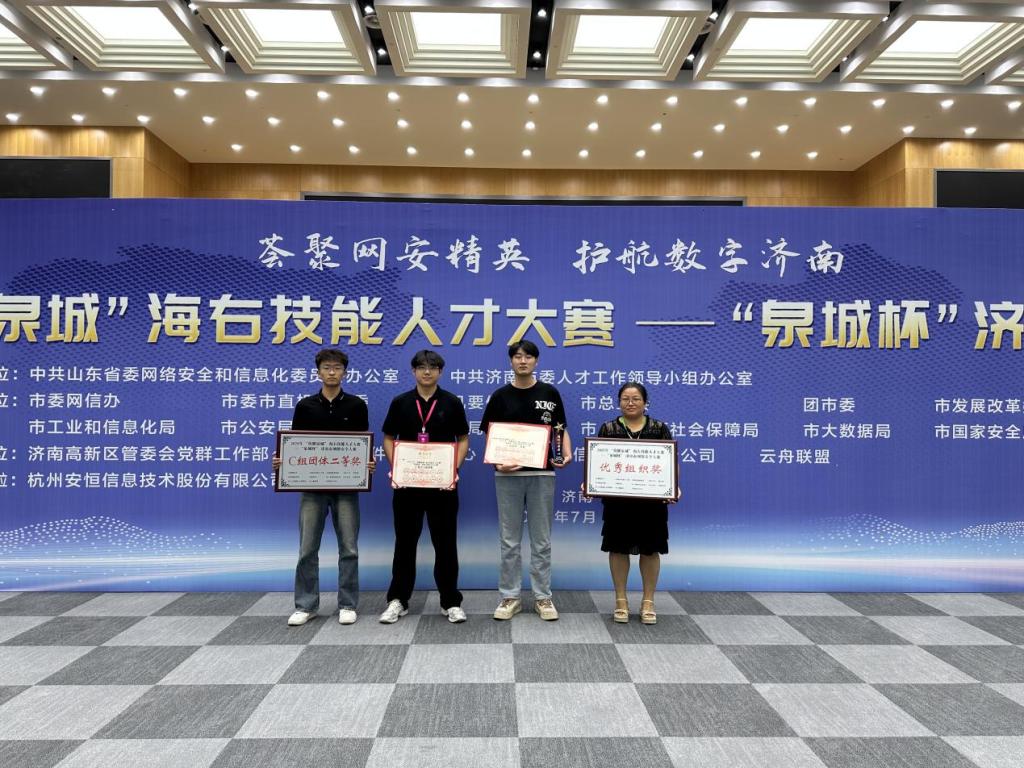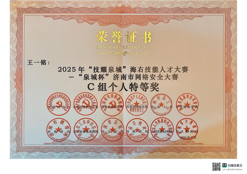 7月15日,2025年“技耀泉城”海右技能人才大赛 ——“泉城杯”济南市网络安全大赛顺利举办。新葡的京集团工学院学生代表队在此次大赛中表现卓越,一路过关斩将,荣获C组团体二等奖,王一铭同学夺得C组个人特等奖,学校同时获得优秀组织奖。