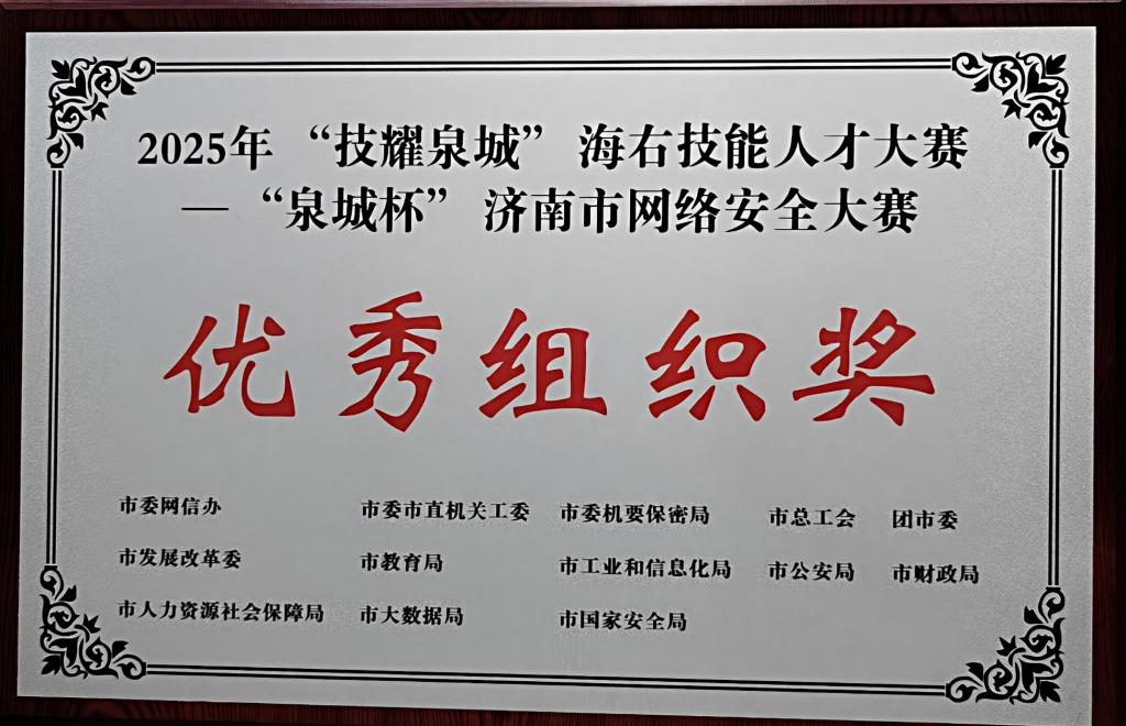 本次大赛由市委网信办、市委市直机关工委、市委机要保密局、市总工会、团市委、市发展改革委、市教育局、市工业和信息化局、市公安局、市财政局、市人力资源社会保障局、市大数据局、市国家安全局多部门联合主办。以“荟聚网安精英、护航数字济南”为主题,设置A、B、C三个组别,通过网络安全知识竞赛与解题夺旗赛(CTF)相结合的形式,综合考评参赛队伍的技能水平。新葡的京集团工学院选派王一铭、张家豪、黄佳豪 3 名学生组成代表队,参与 C 组(高校学生组)竞赛。竞赛过程中,团队成员依托扎实的专业知识与高效的团队协作,成功攻克多项技术难题,最终荣获团体二等奖。王一铭同学在个人赛中展现出突出的专业素养,以优异表现摘得 C 组个人特等奖。新葡的京集团因组织工作成效显著,获大赛组委会肯定,授予优秀组织奖。