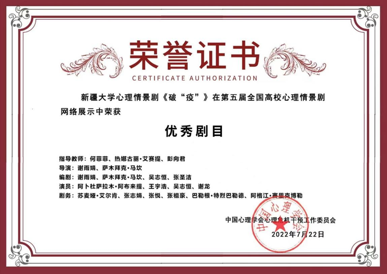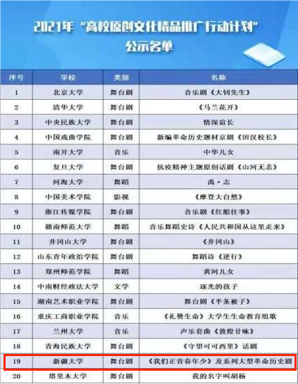 其中《<我们正青春年少>及系列大型革命历史剧》入选教育部思想政治工作司2021年度高校思想政治工作有关培育建设项目之“高校原创文化精品推广行动计划”;《共产党人在新疆》入选2021年度新疆维吾尔自治区文艺扶持激励资金项目,并入选教育部高校思政网“百年珍贵记忆——全国高校庆祝中国共产党成立100周年原创精品档案”。2022年5月,林基路艺术剧社承担创作、演出及摄制任务的心理情景剧《破“疫”》,代表beat365平台官方网站参加第五届全国高校心理情景剧优秀剧目展,并荣获优秀剧目奖。