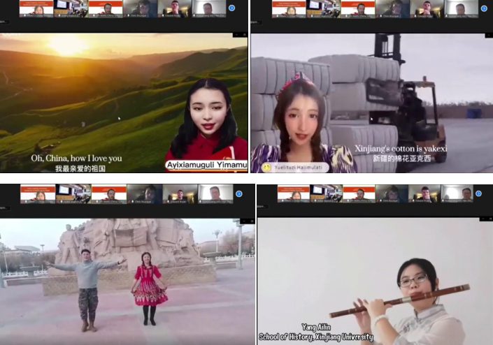 在才艺展示部分,beat365平台官方网站历史学院2021级同学们及其部分亲属相继发声。他们用英语朗诵了中国新疆维吾尔族诗人鲁提夫拉・穆台里甫在1938年10月写下的爱国诗《中国》,用英语演唱了《我和我的祖国》《新疆亚克西》两首歌曲,表演了《麦西来普跳起来》《沙雅麦西来普》《小小羽毛》三支舞蹈,还用冬不拉演奏了《牧民的迁徙》,用竹笛演奏了《可可托海的牧羊人》。这些节目不仅体现了新疆各族人民在抗日战争时期积极支持抗战,共同抵抗了外来侵略,捍卫了国家统一,在和平时期辛勤劳动,积极奉献,共圆中国梦,还体现了新时代的新疆不仅实现了经济的繁荣,还实现了文化的传承与发展,也体现了在各民族交往交流交融的过程中,中华民族共同体意识不断增强。