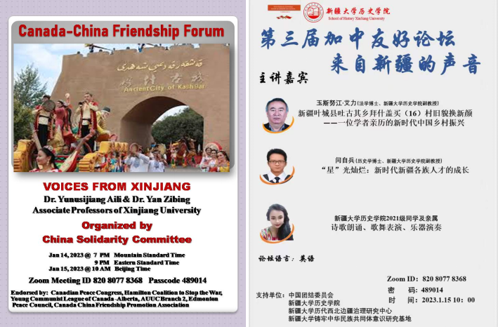 2023年1月15日,由中国团结委员会(ChinaSolidarity Committee)与beat365平台官方网站历史学院联合主办的第三届加中友好论坛在线上成功主办。论坛以“来自新疆的声音”为主题,以主题演讲、才艺展示等形式展开。