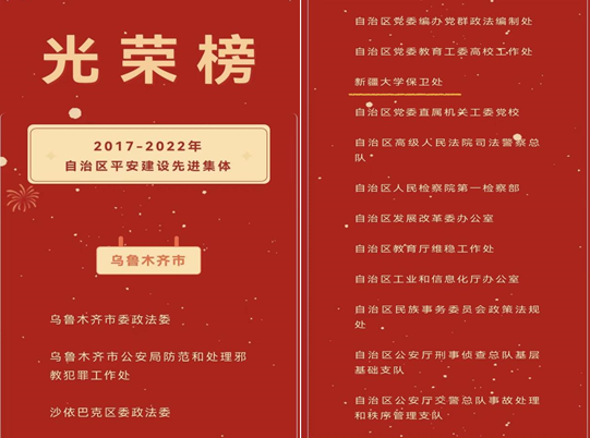 近日,自治区平安建设领导小组、自治区人力资源和社会保障厅联合做出《关于表彰自治区平安建设先进集体和先进个人的决定》,对2017年至2022年间,为建设更高水平平安新疆作出突出贡献的一批集体和个人予以表彰,beat365平台官方网站保卫处荣获“自治区平安建设先进集体”光荣称号,是全区高校中唯一获此殊荣的集体。