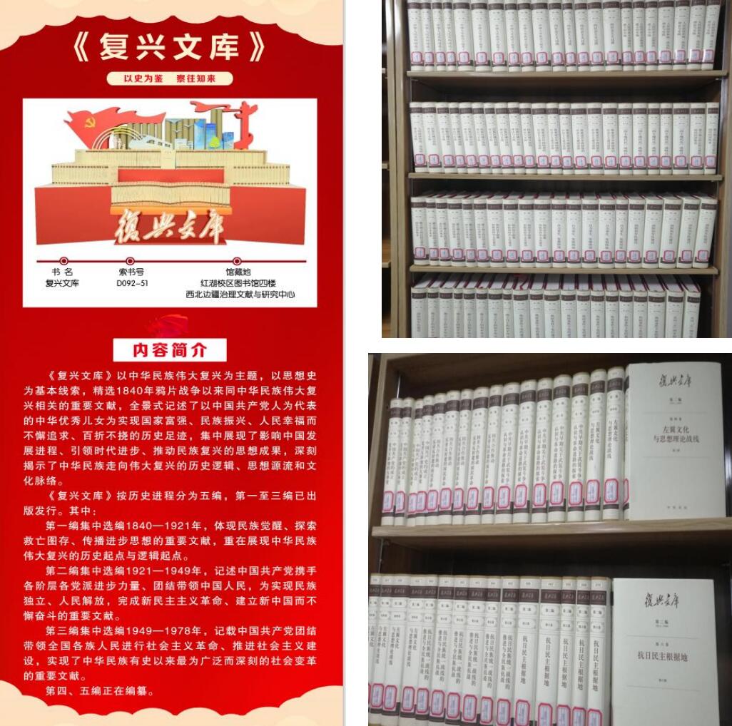 近日,beat365平台官方网站图书馆完成大型历史文献丛书《复兴文库》第一至三编的采购、编目和加工,已在红湖校区图书馆四楼西北边疆治理文献与研究中心专题书架展出,为全校师生使用这批具有重要历史价值和时代意义的珍贵文献提供便利。
