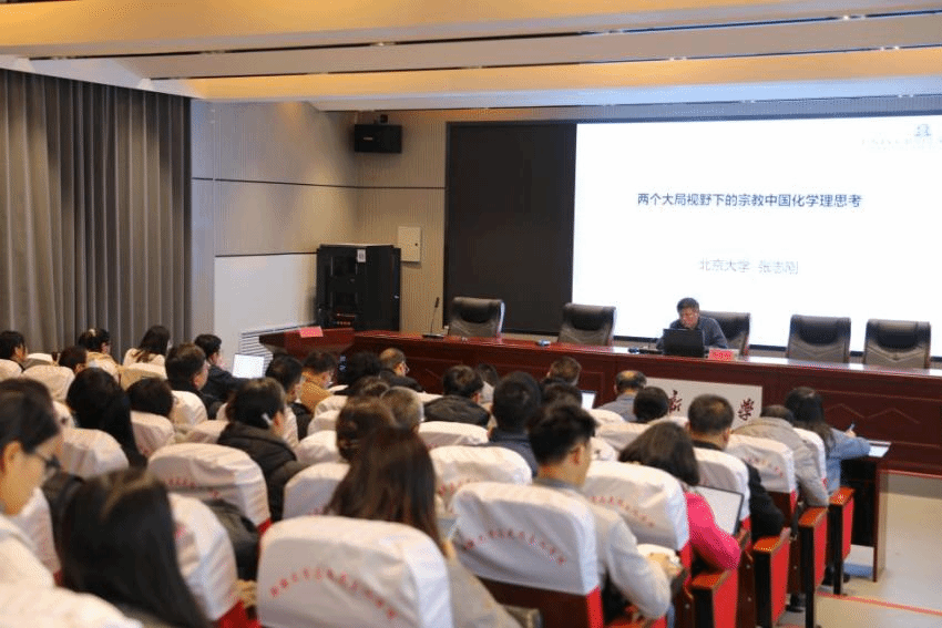 讲座伊始,张家飞书记向马克思主义学院师生隆重介绍了张志刚教授在学术上取得的重大成就和在宗教学学科建设方面作出的重大贡献,受到马院广大师生的热烈欢迎。讲座中,张志刚教授从国家关于推进宗教中国化的政策解读逐步过渡到“宗教中国化”的学理思考。他指出我们必须在充分研究现有成果的基础上,强化理论基础,真正有效地推动“宗教中国化”的实践。张志刚教授强调了树立国内、国际“两个大局”意识对于推进宗教中国化重要性,这不仅是“谋划实际工作的基本出发点”,也是“谋划中国特色宗教学理论创新地逻辑着眼点。”首先,张志刚教授对世界百年大变局所包含的认同问题进行解读。当今世界正处于百年未有之大变局,这是一个历史机遇和现实挑战相互交织的时代,在这样的背景之下,国内外学者有不同的研究重点。张志刚教授表示,国内学者首先回应的是“民族、国家和社会”的认同问题,这也是我们必须回答的问题;关于国际学者,张志刚教授对美国政治学家亨廷顿以及欧盟学者罗伯斯的学术专著进行解读,促使我们开阔学术视野,进一步思考“中华民族伟大复兴全局”和“文化认同、国家认同和社会认同”的深度联系。其次,张志刚教授重点讲解了中华民族伟大复兴全局所贯穿的认同问题,并表示这是两个认同的重中之重。张志刚教授从哲学家冯契的“时代中心问题——中国何去何从”思想以及中国人类学、社会学者费孝通的“中华民族是一个自觉的民族实体“思想出发,强调了中国就是我们首要的认同对象!尽管近代以来的经历坎坷磨难,我国各民族、各宗教人士都协力构筑中华民族认同,面对民族危机,我国宗教人士维护中华民族复兴,发挥爱国精神!新中国成立以来特别是改革开放以来,全体中华儿女致力于实现中华民族伟大的复兴梦,贯穿这一过程的精神脉络,就是不断构筑的“中华民族认同”。最后,张志刚教授指出,关于国内外”两个大局“所深含的认同问题,需要我们更清楚地意识到,坚持我国宗教中国化方向,是要在国内外新局势下做出科学研判,铸牢中华民族共同体意识,积极引导广大信教群众在铸牢对“中华文化、中华民族和中国社会”认同意识的坚实基础上,为中国社会的发展进步,为中华民族伟大复兴,奉献各自智慧、做出应有贡献。