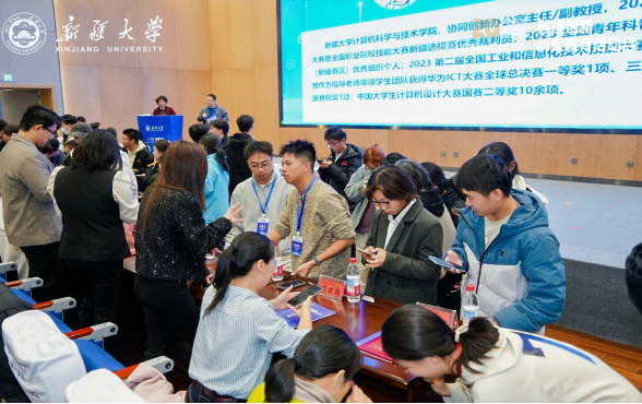 活动的核心环节——“师生面对面”自由交流与双向选择洽谈将现场气氛推向高潮。在主持人的引导下,各位导师移步至指定交流区,同学们则根据自身项目的领域方向、技术需求及个人兴趣,主动、有序地与心仪的导师进行深入沟通。会场内,思维碰撞,交流热烈,师生们围绕项目构思、技术难点、市场前景、团队建设等话题展开讨论,不少师生在现场初步达成了结对意向。期间,会场设置的“智汇青春·创梦新疆”双创风采展示区也吸引了众多目光。经过一段时间的深入交流,活动进入温馨而富有纪念意义的合影环节。成功“双选结对”的师生们纷纷来到舞台前方,用镜头定格下这携手开启共同奋斗旅程的珍贵瞬间。现场掌声雷动,共同祝福每一对师生在未来取得丰硕成果。