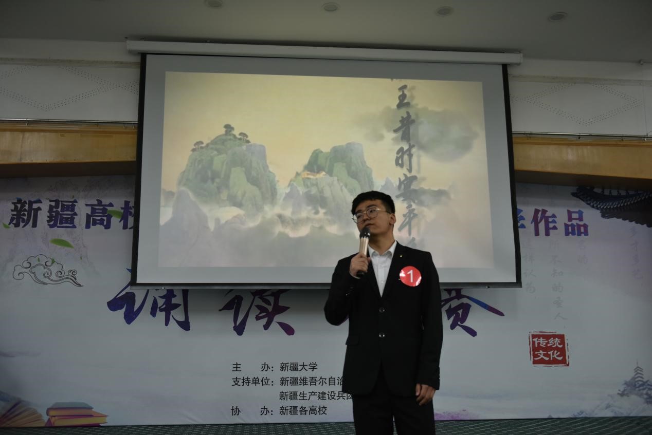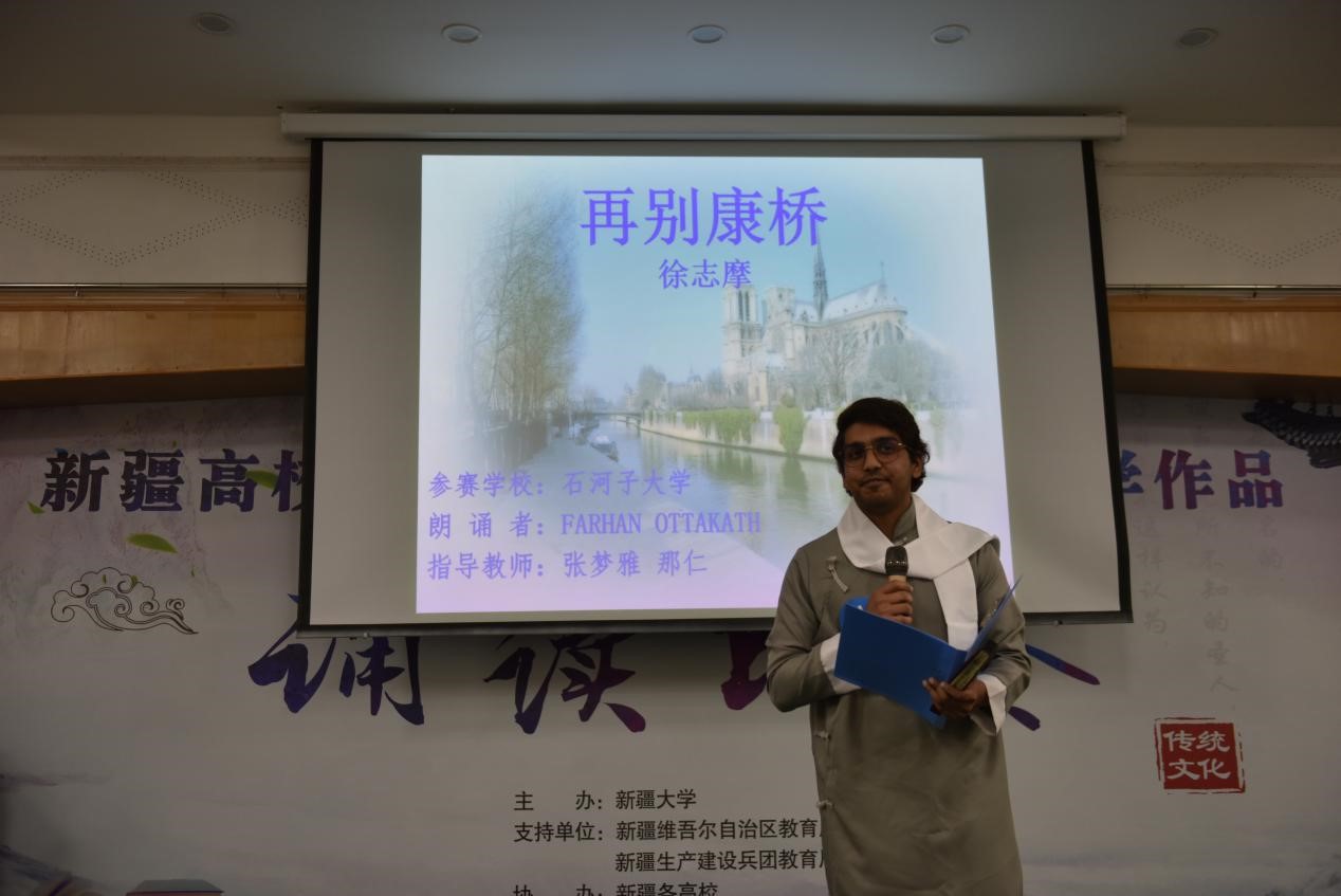 石河子大学国际学生FARHAN OTTAKATH在诵读《再别康桥》