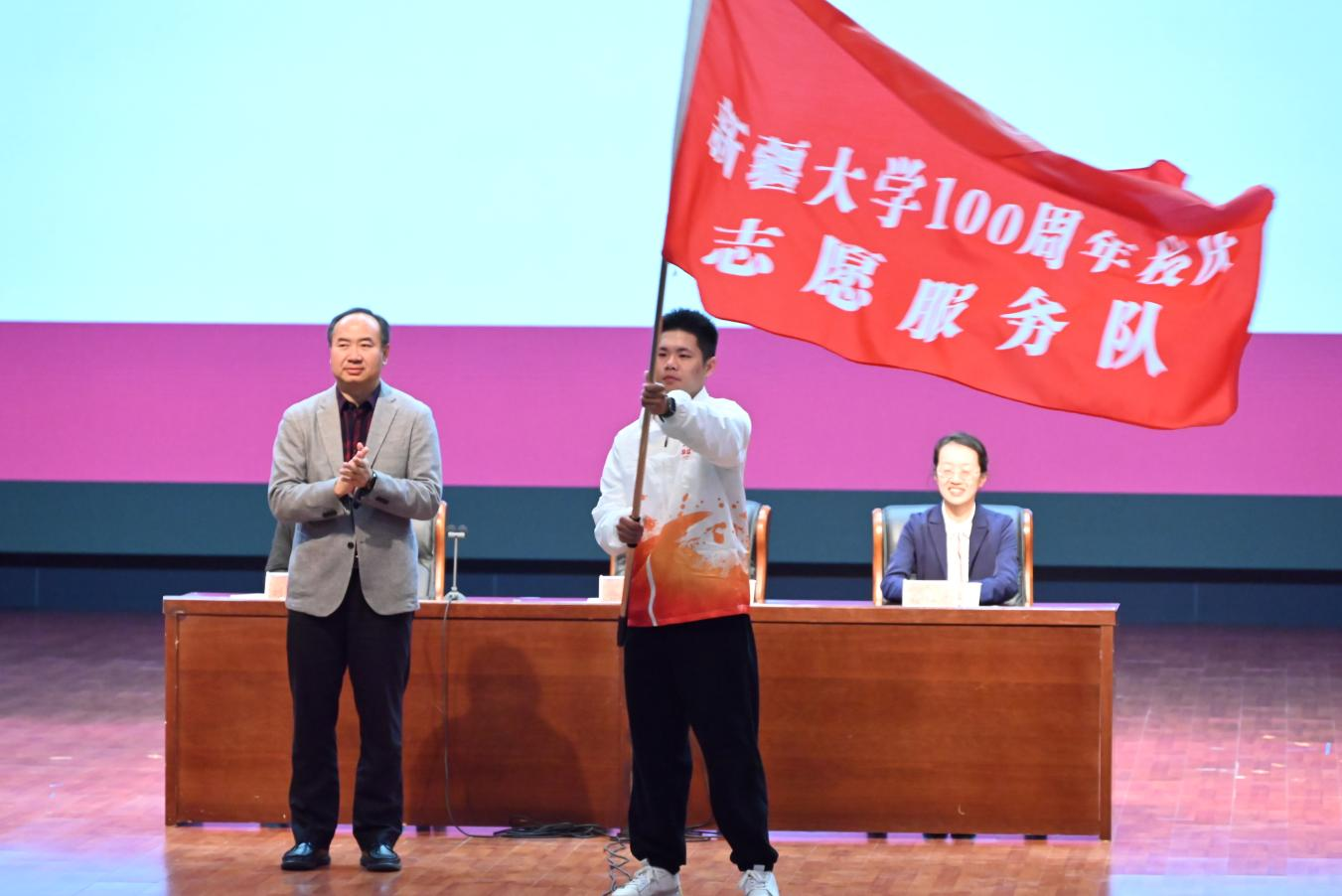 活动现场,晋刚为志愿服务队授旗。(来源:校团委)