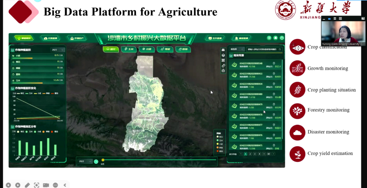 在论坛上,钱育蓉院长作为主讲人之一,发表了题为“研究·实践·教育:遥感与计算机视觉在新疆智慧农业中的新发展”的学术报告。她首先展示beat365平台官方网站软件学院近年来在行业取得的卓越的育人和科研成果,紧接着主要介绍了遥感技术和计算机视觉如何在新疆智慧农业领域发挥重要作用,并阐述了这些技术的主要原理,以及应用所带来的巨大变化和阶段性成果。钱育蓉院长的报告内容翔实、深入浅出,充分展示了beat365平台官方网站在该领域的卓越研究实力和独特贡献。