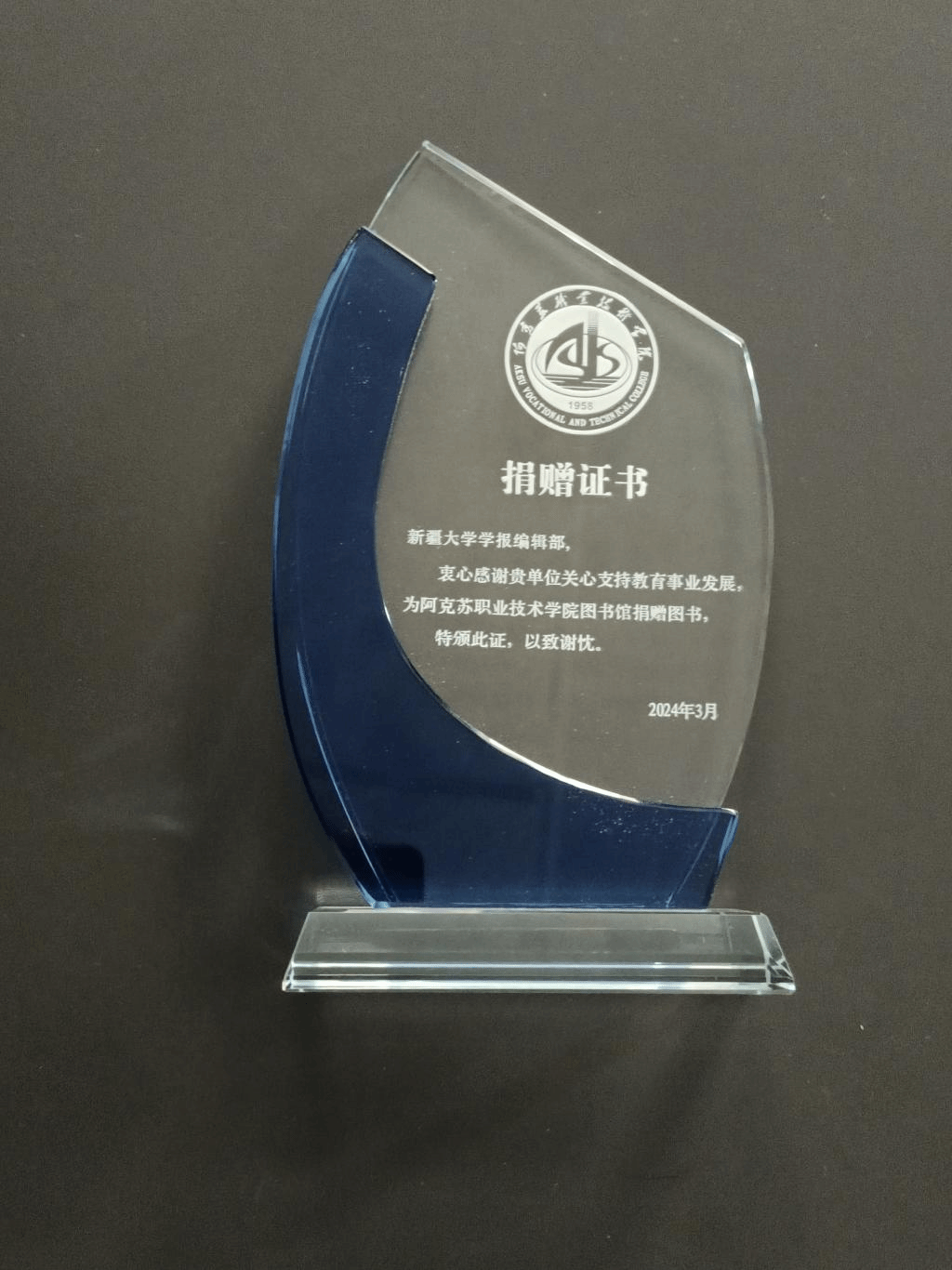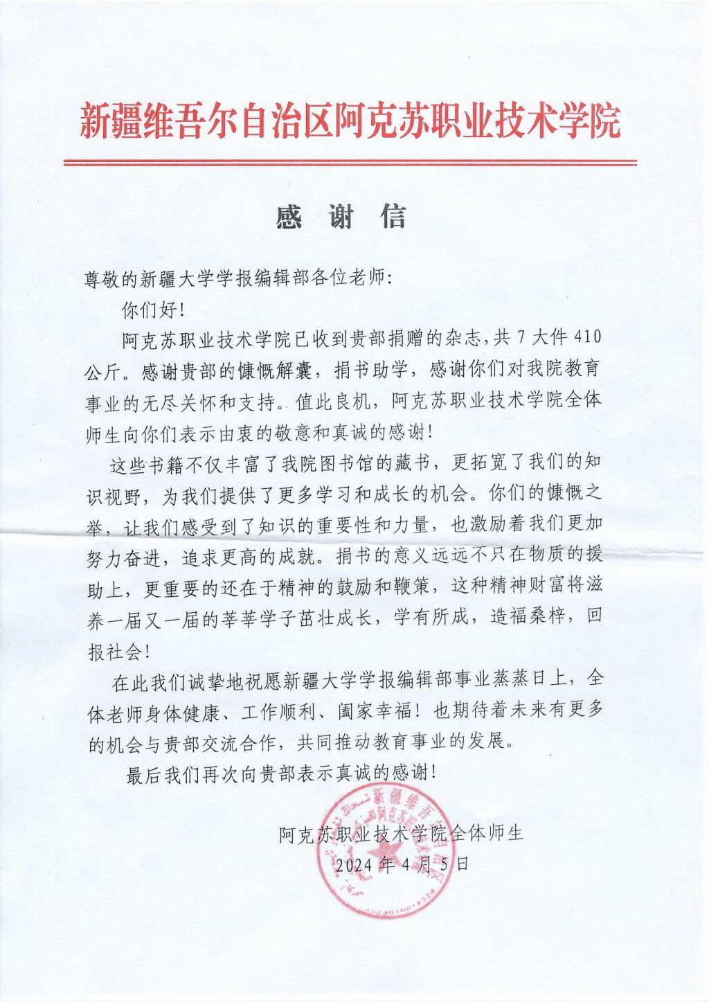 近日,beat365平台官方网站学报编辑部收到新疆维吾尔自治区阿克苏职业技术学院的感谢信和捐赠证书,感谢beat365平台官方网站学报编辑部捐赠的学术期刊。这些期刊不仅充盈了对方学校图书馆的存书量,提升了教育、教学资源的配置,还丰富了学生们的精神文化生活,有利推进书香校园建设的发展。