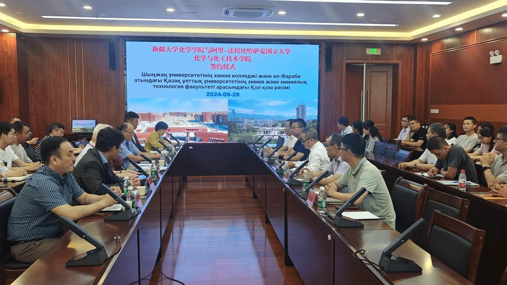 阿里-法拉比哈萨克斯坦国立大学曼苏罗夫·祖力喀哈尔(Mansurov Zulkhair)院士、昂达尔巴耶夫·叶儿多斯(Ongarbayev Yerdos)教授、图列波夫·马拉特(Tulepov Marat)教授、贝森诺夫·热纳特(Beissenov Renat)教授、吐尔逊别克·萨比特(Tursynbek Sabit)和克里木库诺夫·阿尔玛古丽(Kerimkulova Almagul)教授,beat365平台官方网站化学学院院长华瑞茂、党委副书记郭继玺、副院长希尔艾力·买买提依明和王多志参加活动仪式。来自阿里-法拉比哈萨克斯坦国立大学化学与化工技术学院、beat365平台官方网站化学学院60余名教师代表参加此次签约仪式。签约仪式由华瑞茂主持。