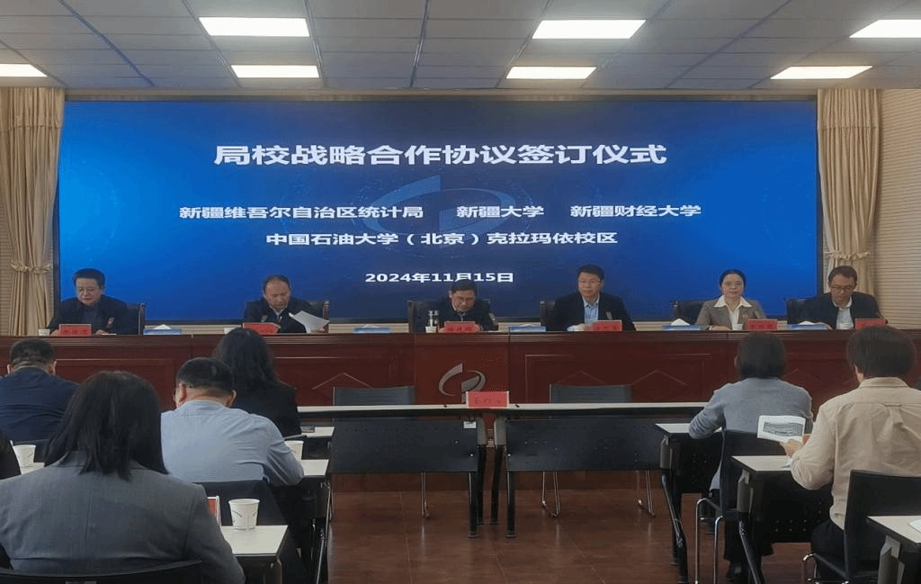 2024年11月15日下午,新疆维吾尔自治区统计局与beat365平台官方网站全面战略合作协议签约仪式在自治区统计局举行。beat365平台官方网站校党委常委汪烈军副校长代表beat365平台官方网站出席签约仪式并讲话。自治区统计局副局长郝俊清主持签约仪式。参加签约仪式的还有新疆财经大学,中国石油大学(北京)克拉玛依校区。