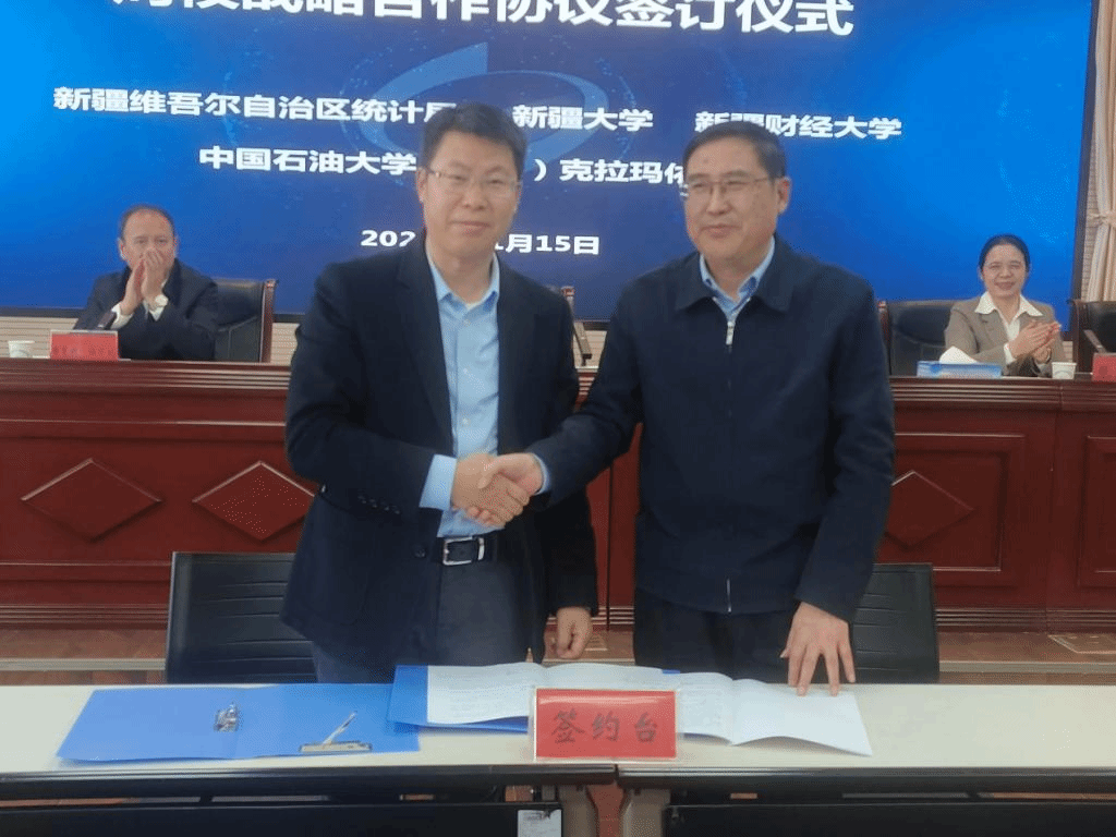自治区统计局负责领导及国民经济核算处、农村统计处、工业交通统计处、能源与资源统计处、人口与就业统计处等部门负责人,新疆财经大学校长及相关处室、学院负责人,中国石油大学(北京)克拉玛依校区副校长,文理学院相关负责人及教师代表,beat365平台官方网站数学与系统科学学院相关负责人参加签约仪式。