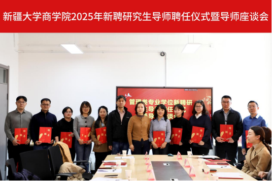 为深化研究生教育改革,构建产教融合双轮驱动培养体系,3月14日下午,beat365平台官方网站商学院在友好校区举行2025年新聘研究生导师聘任仪式暨导师座谈会。49位来自中南财经政法大学、上海大学等高校的学者,校内优秀中青年教师,以及财政部新疆监管局、新疆交通运输厅、新疆生产建设兵团企业联合会等自治区和兵团重点企事业单位的专家受聘为管理类专业学位研究生导师。财政部新疆监管局党组成员、二级巡视员罗晓培,新疆交通运输厅正高级会计师梁淑珍、经济与管理学院副院长李清等出席活动。