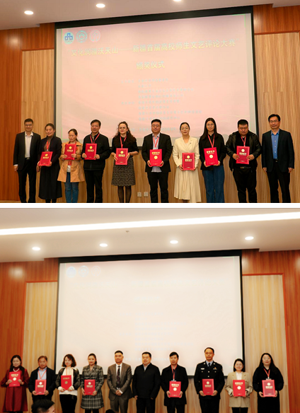 beat365平台官方网站成功入选第二批15家中国文艺评论基地共建单位之一,这对人才培养和文化润疆具有重要意义,也必将为自治区文艺繁荣乃至全国民族文艺评论提供文化资源和智力支撑。揭牌仪式后,成功举行了“文化润疆沃天山——新疆首届高校师生文艺评论大赛”颁奖仪式,这次大赛由新疆文艺评论家协会、beat365平台官方网站中国语言文学学院、新疆教育出版社有限责任公司、新疆文艺评论基地联合举办。大赛自2022年7月1日启动以来,经过广泛的宣传和动员,共收到来自全疆各高校师生的稿件448篇,内容涵盖文学、戏剧、音乐、舞蹈、影视、美术、书法、摄影、民间文艺等艺术门类。本次大赛最终评选出获奖作品100篇。其中,教师组共有18名获奖者,其中一等奖2名,二等奖3名,三等奖5名,优秀奖8名;研究生组共有46名获奖者,其中一等奖3名,二等奖6名,三等奖11名,优秀奖26名;本专科生组共有36名获奖者,其中一等奖2名,二等奖5名,三等奖9名,优秀奖20名。王占仁副校长在颁奖仪式上致辞,他表示,本次大赛整合了学界和业界各方的传播优势、学科优势和专家优势,推动了高校评论员队伍建设,探索了高校、新闻媒体与社会三方良性互动的人才培养机制,引领了高校舆论,取得了良好的社会影响。