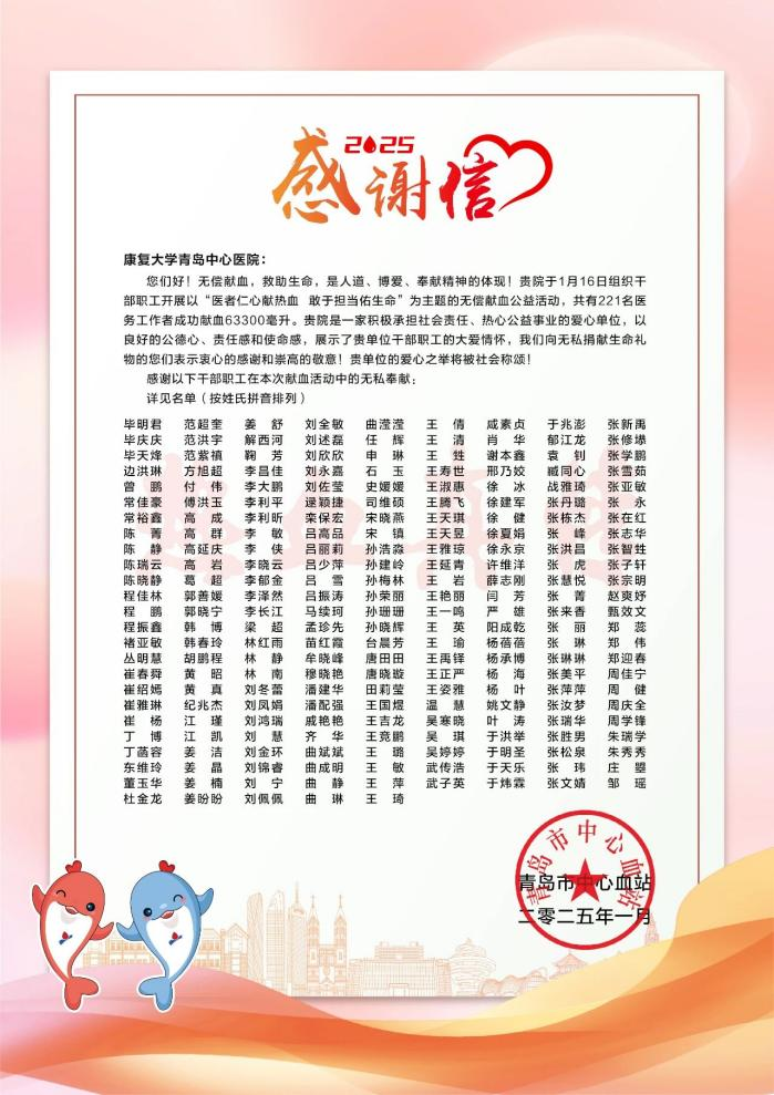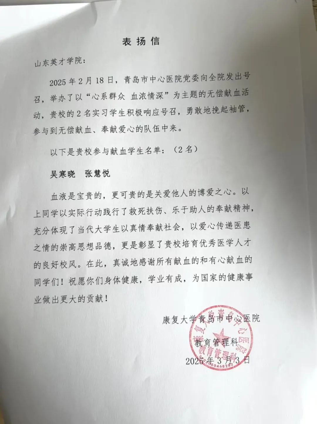 实习期间,吴寒晓、张慧悦同学在康复大学青岛中心医院举办的无偿献血活动中,积极参与,展现了高度的责任感和无私奉献的精神,为无偿献血事业增添了一份力量。