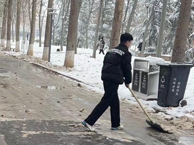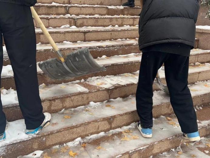 成员们排队来到了实践地,看到社区里的积雪义无反顾地开始进行清雪活动。天寒地冻的天气也没有阻碍到成员们滚热的心。成员们手拿簸箕,扫帚和雪铲加入到了热火朝天的清扫中。
