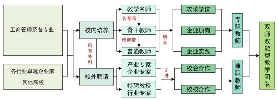 工商管理系重视师资队伍建设,实施“首要工程”,加强师德师风建设。推行青年教师导师制、定期研讨制,落实教学竞赛、英才一课等培育措施,建立长效培养培训机制。通过 “传帮带” 培育制度,由老教师指导新教师,并组织研讨会、观摩优质课等。系内获得多项教学荣誉,包括省级教学成果奖三等奖、3项校级教学成果奖,以及在校“英才一课” 教学比赛中的多个奖项。