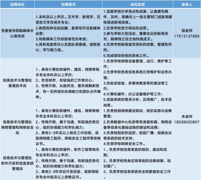 招聘要求:1.本科及以上学历;2.中共党员(含预备党员);3.有志于从事高校学生思政工作,热情积极主动,有良好的文化素养和道德品质,热爱大学生思想政治教育工作,有强烈的事业心、工作责任感和团队精神;4.在中学和大学期间当过班长和学生会主要干部优先,教育学、心理健康类等专业优先;5.年龄28周岁以下。