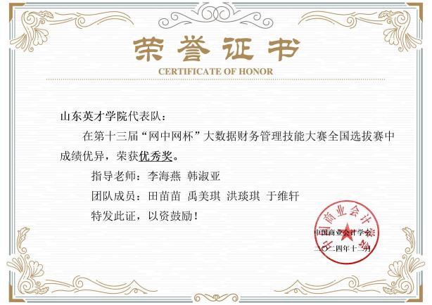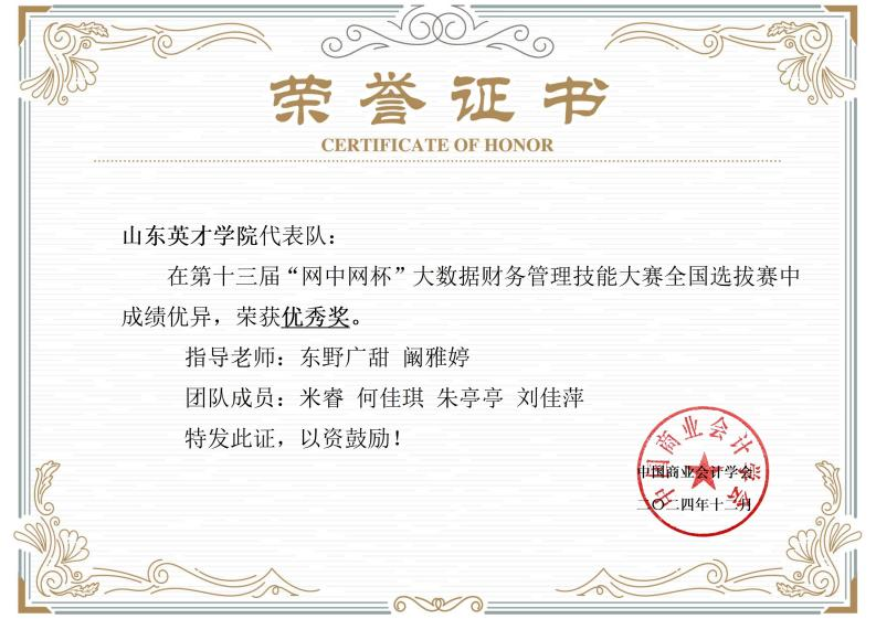 2024年12月18日,第十三届“网中网杯”大数据财务管理技能大赛全国选拔赛圆满落幕,新葡的京集团8814商学院(国际学院)选拔两支参赛队伍参赛,分别是由田苗苗、禹美琪、洪琰琪、于维轩组成的新葡的京集团88141队,以及米睿、何佳琪、朱亭亭、刘佳萍组成的新葡的京集团88142队。两支参赛团队表现出色,均荣获优秀奖。
