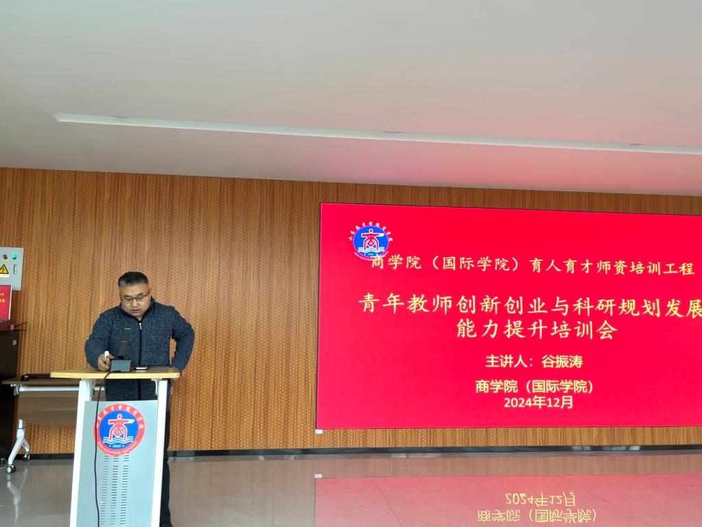 为提升商学院(国际学院)青年教师的科研能力和创新创业能力,进一步推动商学院(国际学院)的教育教学改革和科研发展,商学院于12月25日在商学院学术报告厅举办了一场针对青年教师的创新创业与科研规划发展能力提升的培训会。本次培训由商学院金融系主任、副教授谷振涛老师主讲,商学院“育人育才师资培训工程”全体青年教师参加。