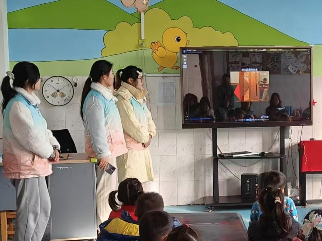 图为实践团成员和小朋友观看视频