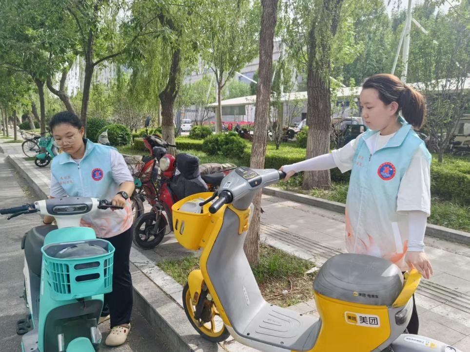 实践的成员到达人行道旁摆放电动车。为市民对交通安全问题的重视,共同营造安全、文明的城市交通环境。
