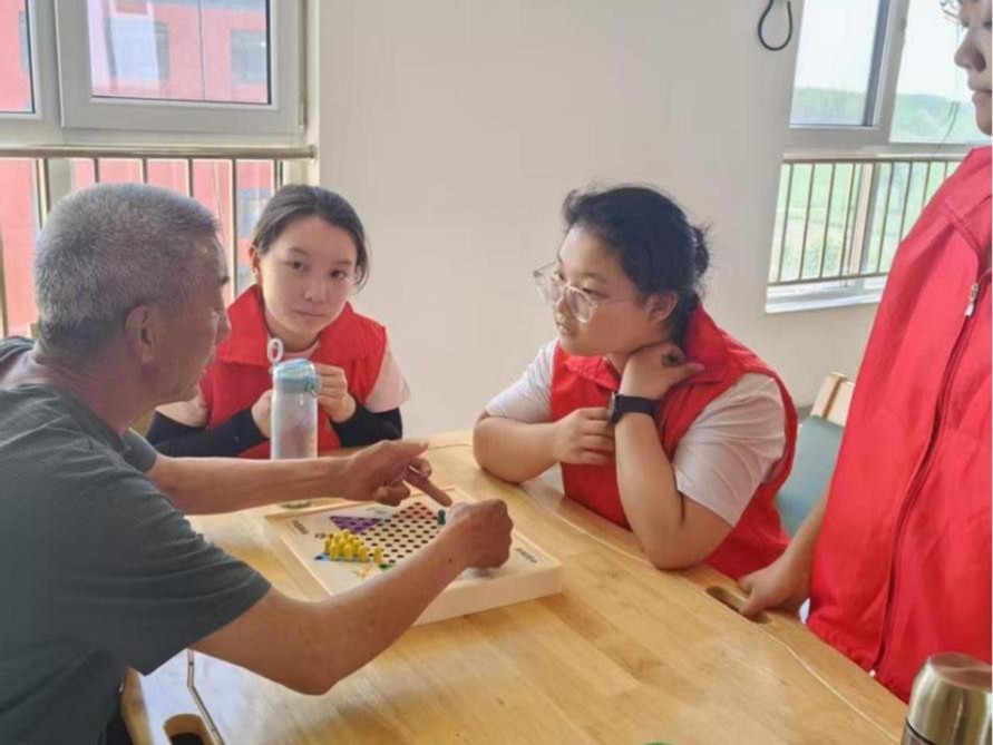 在另一旁,几位志愿者与老人围坐在桌前,摆开了跳棋棋盘,和老人一起下棋。