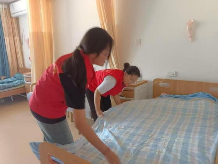 活动当日,志愿者们身着整齐而鲜艳的红色马甲,早早地便抵达了养老服务中心。一进大门,他们便迅速按照计划投入到各项服务中。房间里,志愿者们抚平床单上的褶皱,让床铺变得更加舒适。