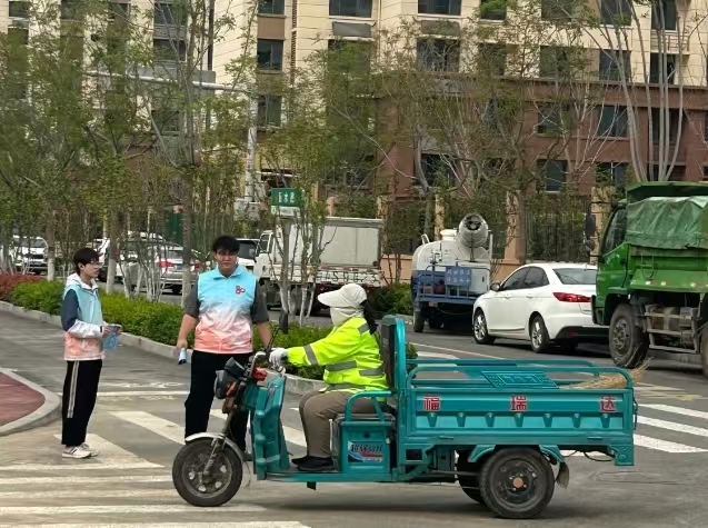 随后,实践团成员们来到鹊华理想社区,积极展开“一盔一带”宣传活动。成员们向社区人员详细讲解佩戴头盔和系安全带的重要意义,并通过展示真实的事故案例,让社区居民更直观地认识到安全防护措施的重要性。为了让居民更好地掌握正确佩戴头盔的方法,同学们还在现场进行了示范,耐心解答居民提出的疑问。随后,在交警的带领下,学子们走上街头,协助交警进行交通疏导。他们身着志愿者服装,手持引导旗,认真地引导行人过马路,对闯红灯、不走斑马线等不文明行为进行耐心劝导。尽管烈日炎炎,但学子们始终坚守岗位,以饱满的热情投入到志愿服务中。