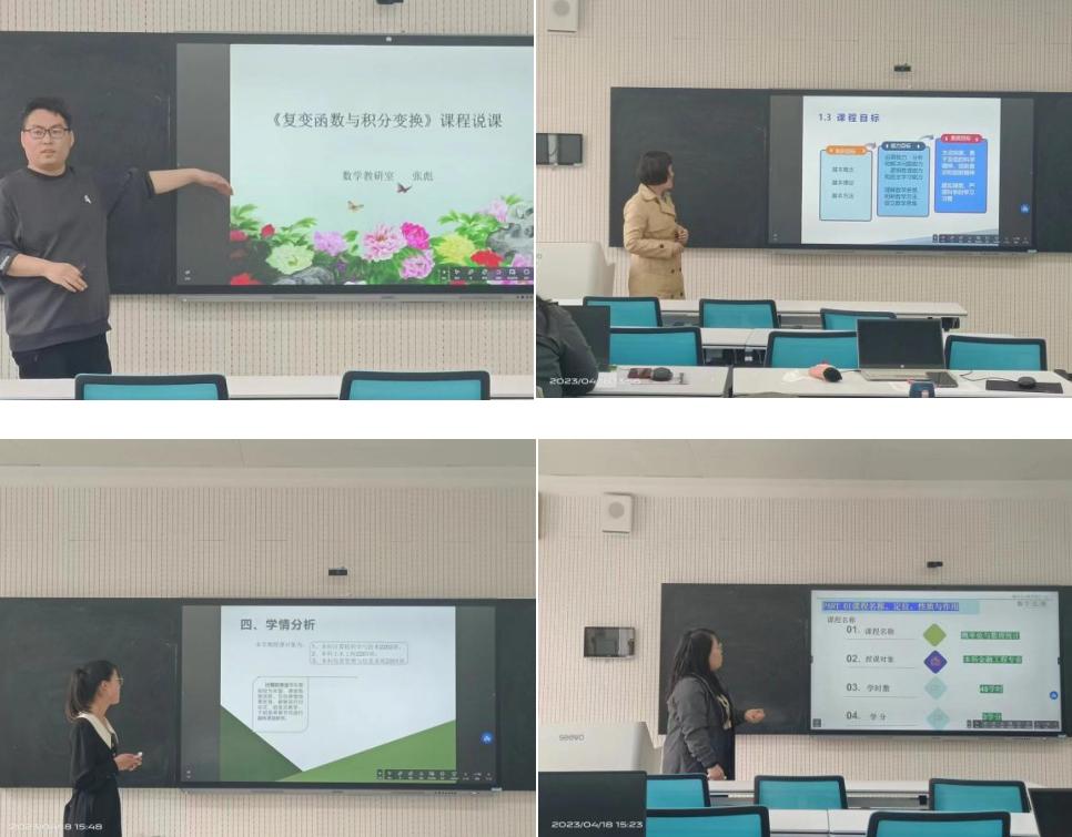 说课交流会上,数学教研室全体教师,从“说课程”的七条标准出发,围绕课程定位与课程目标、教学资源、教学组织与实施、教学评价与考核、教学效果与反馈、教学特色与亮点、下一步改革探索与展望等展开具体阐述,结合自己的教授课程以及工作心得进行了经验的分享与讨论。全体数学教研室教师纷纷表示在今后的工作中,将思政融入课堂,采用多种教学手段与教学评价相结合的方法,提高学生的学习的积极性与创新能力。