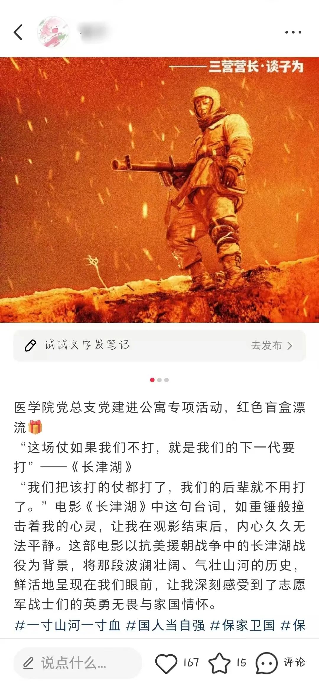 《金刚川》炮火硝烟里,勇士无畏修桥的壮举帧帧画面,深深叩击同学们的心弦观影后圆桌会,思想火花四溅——有同学凝视《长津湖》冻土豆细节,喟叹“幸福源自热血牺牲”从《金刚川》先烈行迹中,悟透“青年担当”厚重真意沉浸式体验,让红色精神从银幕走向青春心田。此次红色观影活动,创新“观影+研讨”模式,将思政课堂搬进生活场景,既让红色基因浸润青春血脉,又引导青年在历史映照下明晰使命。接下来,医学院党总支将持续拓宽红色教育路径,以多元实践赋能成长,让红色火种在青年群体中永续传承、熠熠生辉。树洞解忧活动公寓大厅“红色解忧站”准时启动匿名纸条传心声,一对一谈心暖情学业迷雾巧指引,心理阴霾轻拂散服务深耕有温度,关怀入微暖人心课后“学习强国”竞答赛,掀起趣味挑战热潮积分兑换文创礼,理论学习“参与感”满格同学直呼意未尽,红色养分润青春