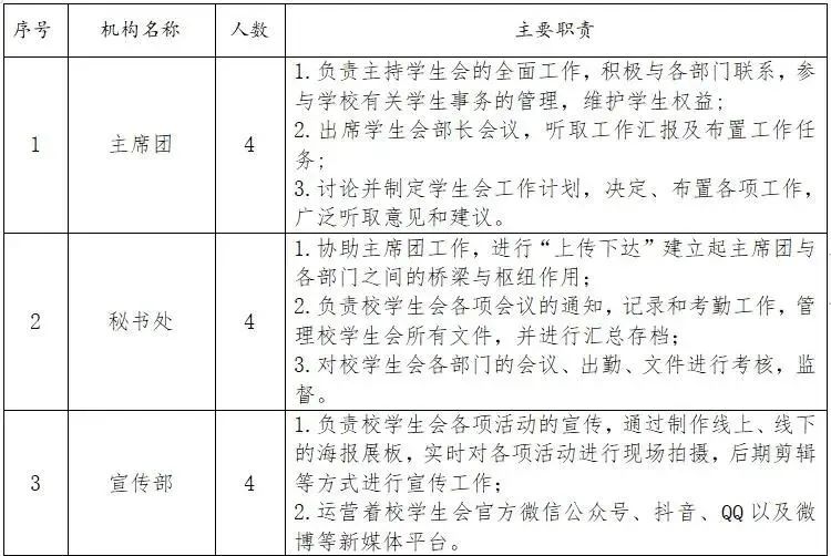 新葡的京集团8814学生会设有“主席团+工作部门”模式。学生会工作人员总数原则上一般不超过 40 人,主席团成员不超过5人。学生会工作部门为 6个,每个部门负责人2-3名,工作人员一般不得超过6人。
