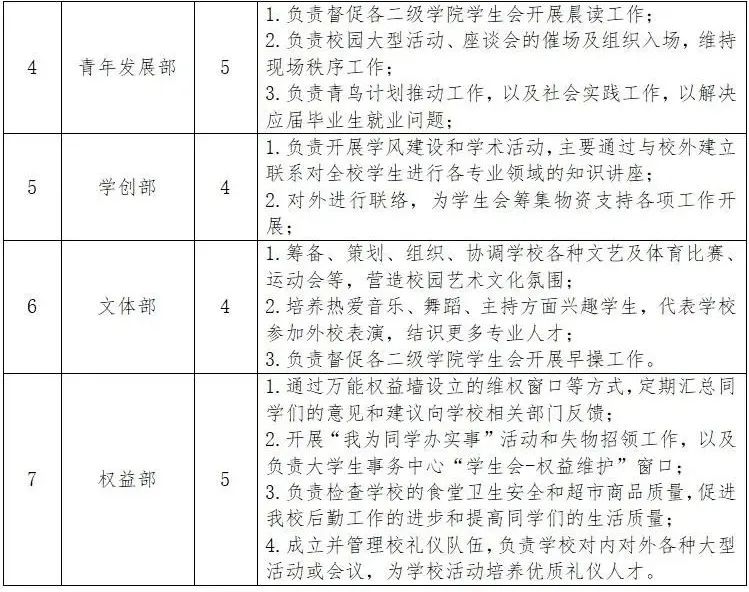 学生会下设秘书处、学创部、权益部、宣传部、青年发展部、文体部6大部门。根据工作需要可由学生会主席团对本机构适当调整。