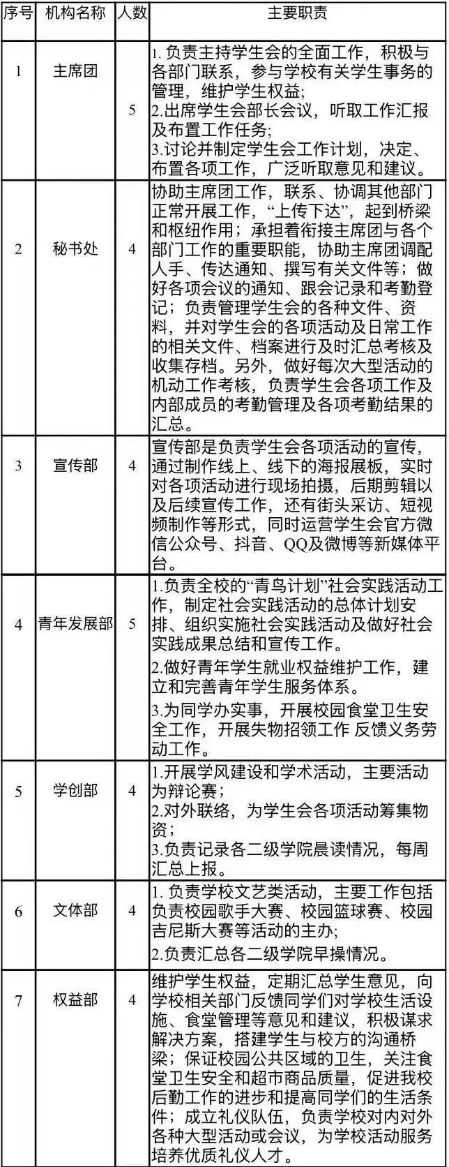 学生会下设秘书处、学创部、权益部、宣传部、青年发展部、文体部6大部门。根据工作需要可由学生会主席团对本机构适当调整。