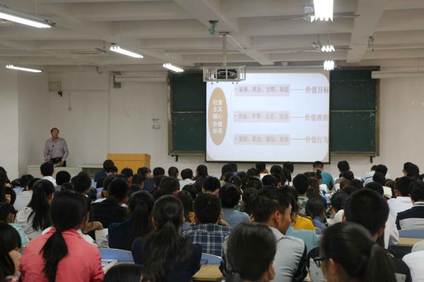 为了提高同学们的思想教育,做新时代高素质大学生,2016年9月29日经济与管理学院在经管楼B-100教室开展“践行社会主义核心价值观,做新时代高素质大学生”会议,参加讲座的有:经济与管理学院行政副院长王广柱,思想政治老师孟文阁,以及经济与管理学院16级学生。会议由王广柱副院长主讲。