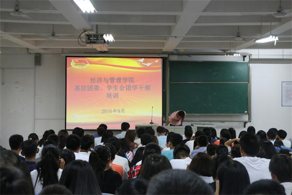2016年9月13日中午12点,经济与管理学院基层团委、学生会团学开展干部培训会议。在经济与管理学院经管楼B-200召开,出席本次会议有:经济与管理学院基层团委学生会主席杨鑫,各部门部长、副部长以及16级团学干事们,杨鑫主席为主讲人。