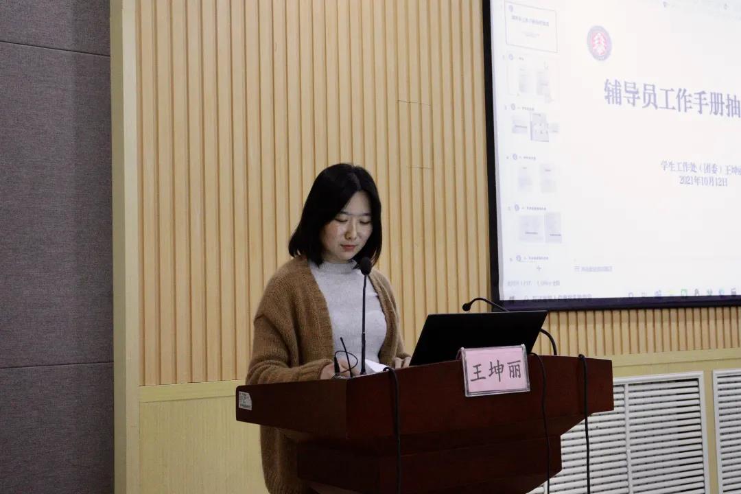 校团委王坤丽副书记主要讲了以下三点:第一,通报近期辅导员工作手册检查情况,对辅导员积极联系学生家长、详细整理会议纪要的行为提出表扬,也希望其他辅导员以此为榜样对工作手册进行整改。第二,明确了辅导员入住学生公寓的管理方法。指出近期辅导员宿舍出现的一些问题,提醒各辅导员以身作则,以更高的要求落实入住学生公寓的工作。第三,提出对辅导员工作的考核调整方法。