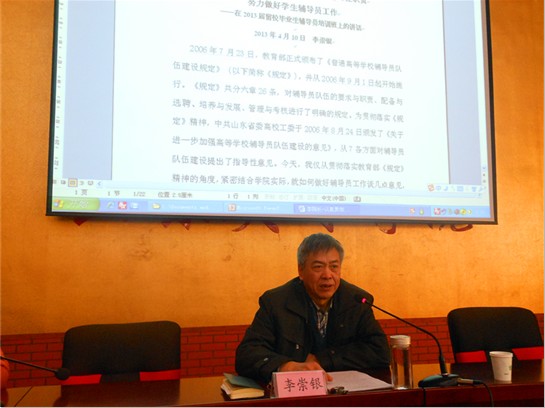 接着,学院副院长李崇银教授作了“认真学习《规定》精神,踏实践行岗位职责,努力做好学生辅导员工作”的报告。李院长用详实的数据分析了我院辅导员队伍的成长历程及现状,要求新留校辅导员为进一步适应学院发展对辅导员队伍的需求与挑战,要对自身定位准确、分清职责。接着,李院长结合教育部文件及我院实际,对辅导员工作岗位职责和角色定位做了深入的解读,并对辅导员工作内容和工作重点做了全面分析。最后李院长要求新留校辅导员要不断学习,提高自身综合素质,加强个人修养,用爱心、热心、细心、耐心、责任心做好学生的“引路人”。