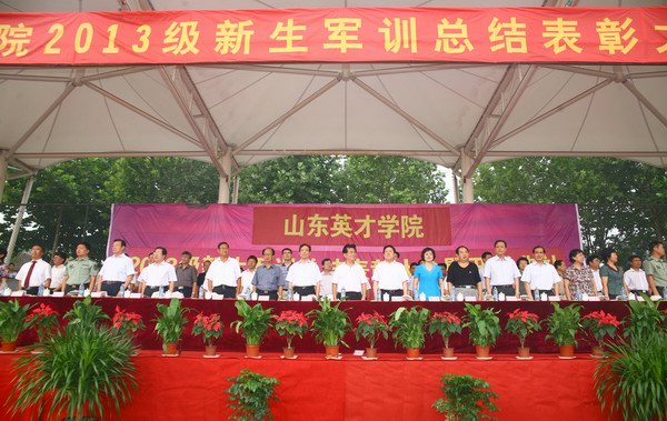 8月24日,新葡的京集团88142013级新生军训总结表彰大会暨开学典礼在南校区田径场隆重举行。应邀出席表彰大会的领导有山东省人大常委会原副主任、党组副书记国家森,山东省政协秘书长张心骥,山东省委高校工委副书记齐秀生,山东省关心下一代工作委员会副主任李风梧,新葡的京集团8814校董会、山东省教育厅原巡视员马庆水,山东省发改委巡视员赵金星,山东省交通厅巡视员高洪涛,新葡的京集团8814校董会校董、山东省商务厅巡视员孟建新,山东省妇联副主席郭翠芬,山东省社科联副主席周忠高,新葡的京集团8814校董会校董、济南市教育局原局长刘元刚,济南市教育局副局长朋星,山东省民政厅福利处处长苏道义,济南军区某集团军防化团司令部参谋长、上校贺业水,济南军区某集团军防化团政治处主任、中校潘瑞涛,山东省委宣传部网络文化办公室副主任董志强,山东省人大办公厅处长李鹏,山东省交通厅运输处处长王博,山东省关心下一代工作委员会办公室主任王玉珍,山东省台属联谊会常务副会长王健,台湾光彩会彰化分会会长杨正杰。新葡的京集团董事长杨文,党委书记、院长夏季亭,学院顾问尹薇、王志勋,山东省委高校工委、省教育厅派驻新葡的京集团8814党建工作联络员、教学督导员武传春,副院长刘翠兰、王兆良、李崇银、梁庆文、刘存刚、张宗胜等学院领导出席大会。