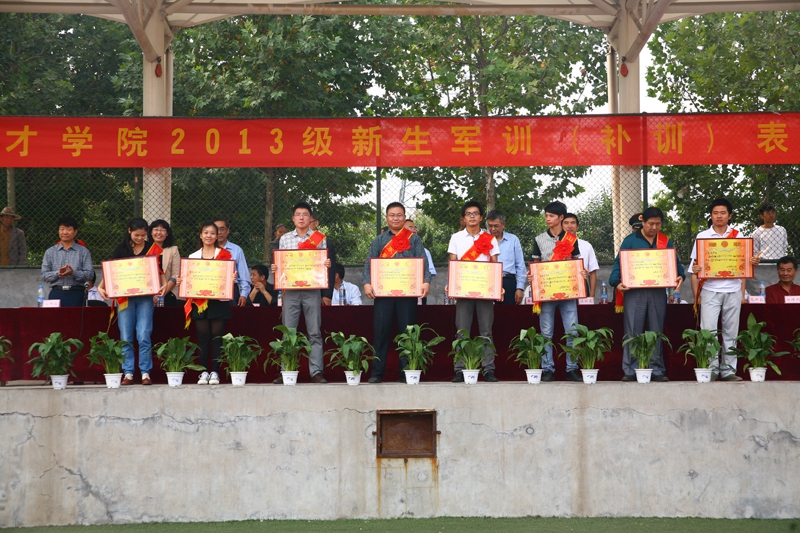 教务处张黎副处长宣读了《关于表彰南校区2013级新生补训期间优秀组织单位奖和优秀训练标兵的通报》,表彰了2013级新生军训补训项目8个获奖单位、15名优秀训练标兵。主席台就座的领导和嘉宾共同为获奖单位和个人代表颁奖。随后由建筑工程学院杨庆年副院长带领补训新生宣誓。