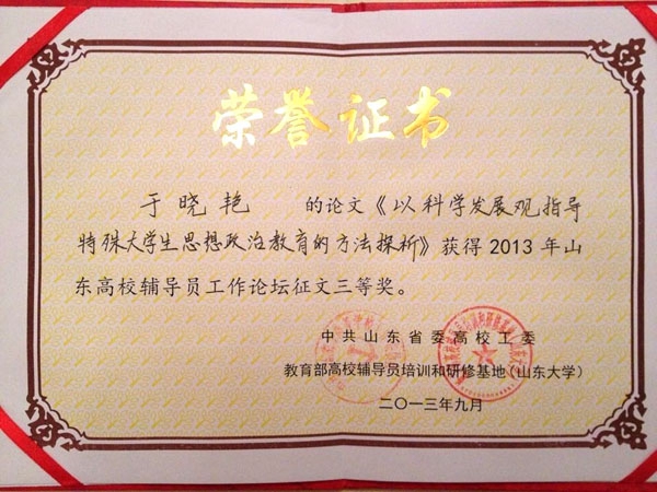 据悉,此次论坛共从全省各高校报送的235篇论文中,评选出一、二、三等奖论文共70篇,新葡的京集团学生处共报送组委会5篇论文,经济管理学院辅导员于晓艳的论文在本次论坛中荣获三等奖。