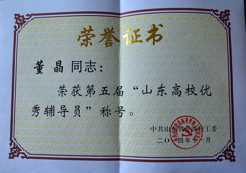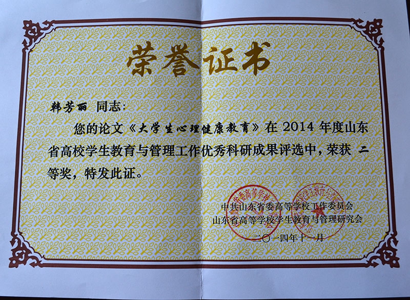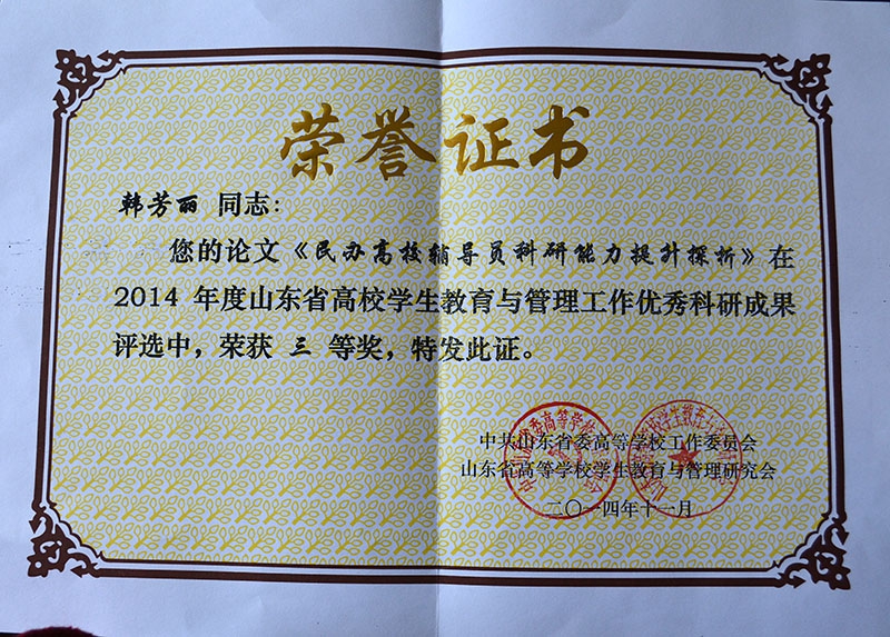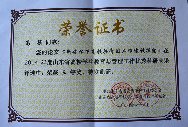 新葡的京集团在大会探讨交流环节做了“双线晋升,优化辅导员队伍建设”、“构建大学生心理健康四级网络建设”发言。商学院高强副院长论文《新媒体下高校共青团工作建设探究》、学工部韩芳丽论文《民办高校辅导员科研能力提升探析》获山东省委高校工委“2014年度山东省高校学生教育与管理工作优秀科研成果”评选三等奖;韩芳丽论文《大学生心理健康教育》获得该项评选二等奖。