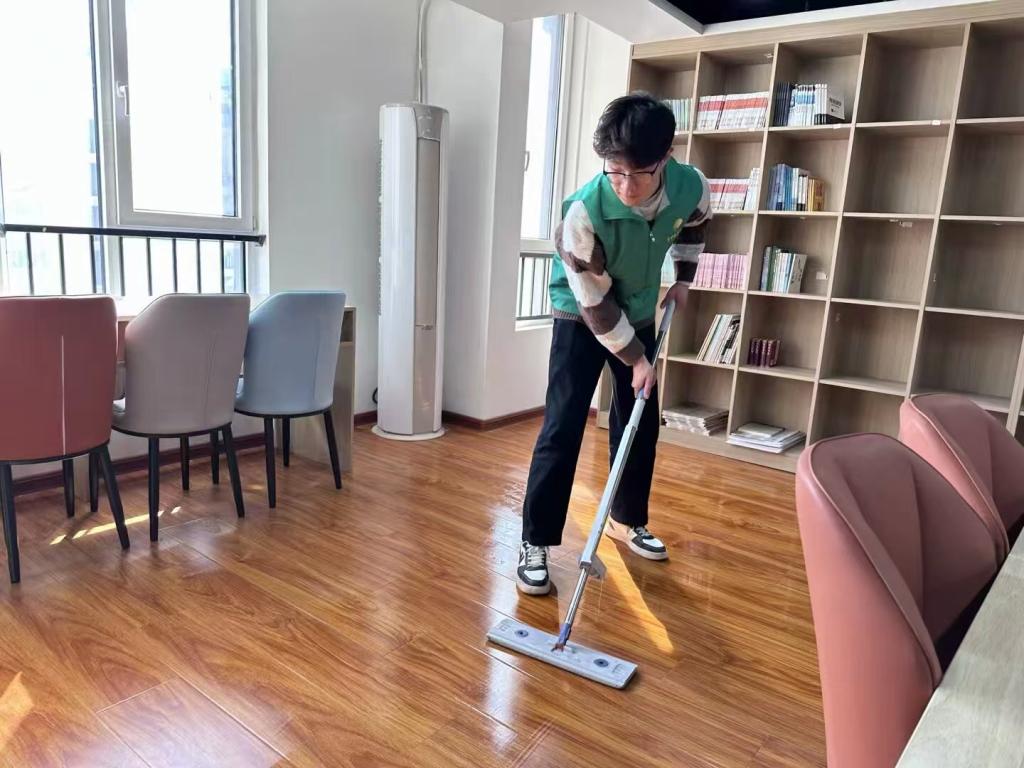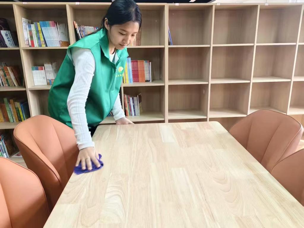 同时,志愿者对图书室桌椅、地面进行深度清洁,细致擦拭桌面污渍,彻底拖洗地面灰尘,并对砚台、笔墨等传统文化用品进行专业保养,从清洁器具到补充墨汁,确保文化设施焕然一新,为居民营造整洁、雅致的阅读环境。