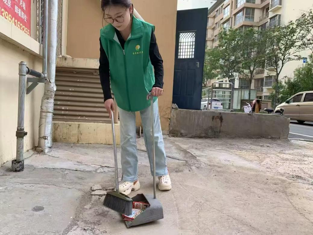 图为实践团成员于月在扫地
