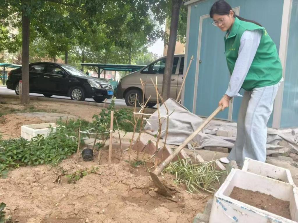 完成街道、绿化带、垃圾桶的清理过后,志愿者们在短暂的休息后便借来了铁锹来为树木松土。在社区的绿化带里,他们手持铁锹、锄头为树木松土、清理杂草。经过志愿者们一上的辛勤劳动与汗如雨下的付出,社区中的树木也焕发了生机。
