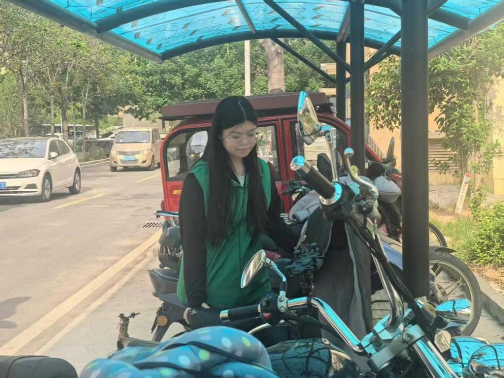 图为实践团成员李雨航在扶起倒下的车辆