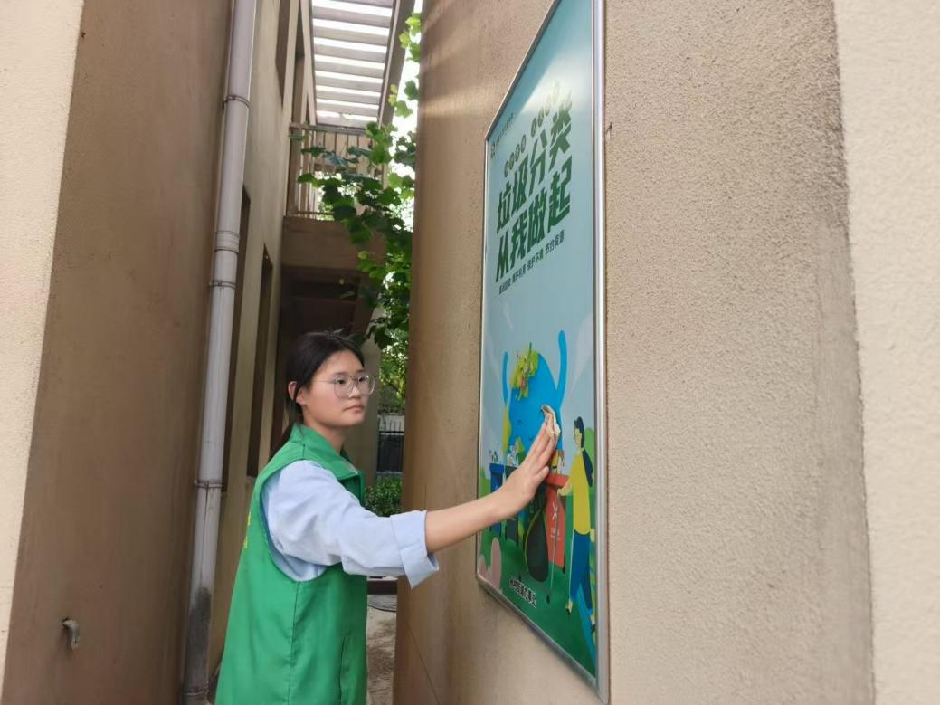 图为实践团成员邹婷在擦拭宣传栏