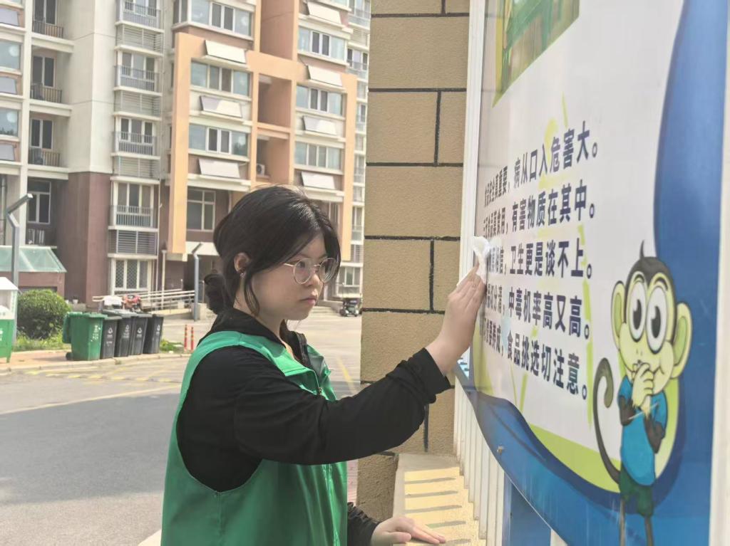 图为实践成员李雨航在擦拭宣传展板