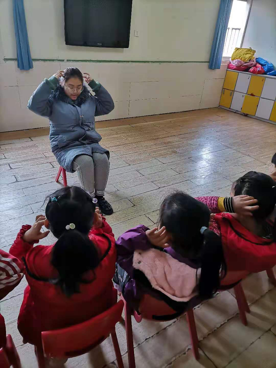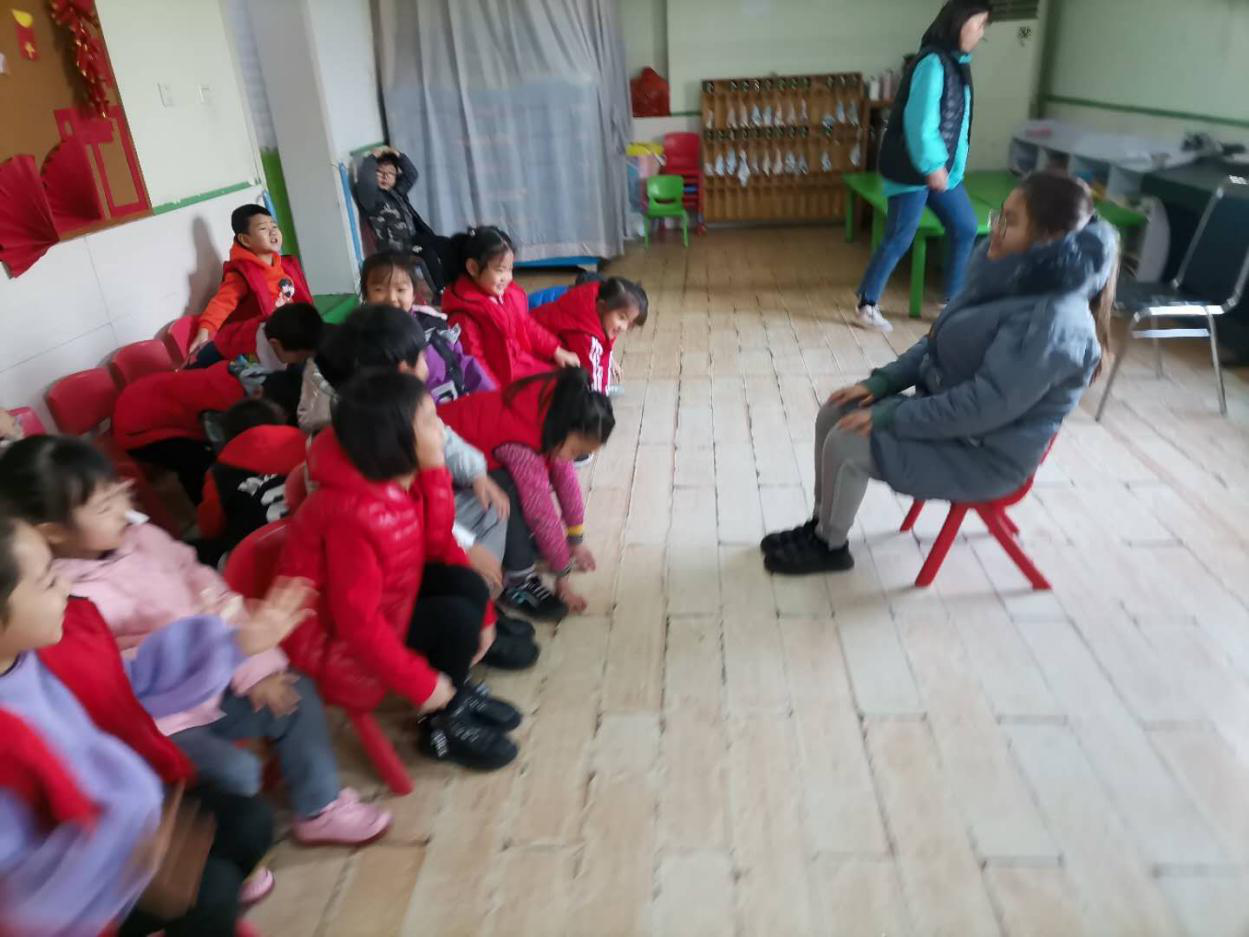 上课时,李萍坐在主班老师后面,发现要与孩子们很好的相处就要接近他们,走进孩子的世界。在活动中,她带领孩子们做游戏,看到孩子们一张张开心的笑脸,仿佛回到了自己的童年时光。和小朋友们做手指操