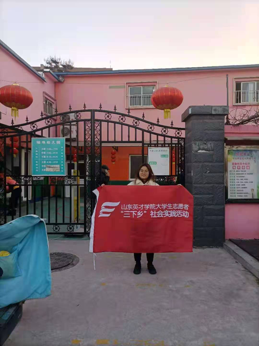 迎着早上8点钟的太阳,高职学前教育1803的李萍在山东省济南市历城区洪家楼社区幼儿园进行社会实践。